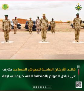 أشرف الفريق محمد المختار مني؛ قائد الأركان العامة للجيوش المساعد، أمس الأربعاء 23 سبتمبر 2025، على مراسم تبادل المهام بالمنطقة العسكرية السابعة، بين العقيد محمد احمد محمود البناني؛ قائد المنطقة السابق، والعقيد عمار حنن؛ القائد الجديد للمنطقة.