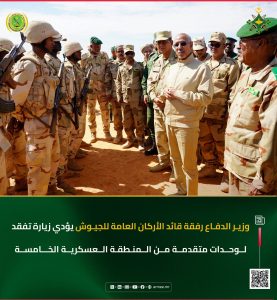 وأبلغ معاليه العسكريين المرابطين على الخطوط الأمامية تحيات رئيس الجمهورية – القائد الأعلى للقوات المسلحة – مثمنا جهودهم في أداء مهمتهم الأساسية المتمثلة في الدفاع عن الوطن، وقيامهم بالعمل المنوط بهم على المستوى المطلوب، ومشددا على أهمية اليقظة والمحافطة على الجاهزية في كل الظروف، والتمهر في معرفة واستخدام الوسائل، وصيانتها، والمحافظة على التدريب المستمر.