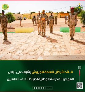 أشرف الفريق محمد فال الرايس الرايس؛ قائد الأركان العامة للجيوش، صباح اليوم الجمعة 10 اكتوبر 2025، على مراسم تبادل المهام بالمدرسة الوطنية لضباط الصف العاملين، بين العقيد عمار أحمدو حننَّ ؛ قائد المدرسة السابق، والعقيد محمد أحمد الحاج أحمد، القائد الجديد للمدرسة.