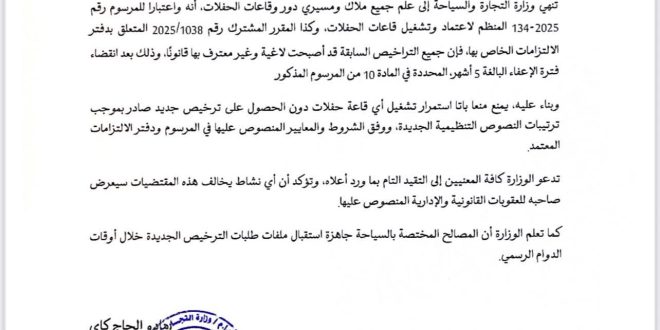 أعلنت وزارة التجارة والسياحة أن جميع التراخيص السابقة لتشغيل دور وقاعات الحفلات أصبحت لاغية وغير قانونية، خاصة بعد انتهاء فترة الإعفاء المحددة بخمسة أشهر، وذلك بموجب المرسوم رقم 134-2025 والمقرر المشترك رقم 2025/1038 المتعلقين بتنظيم القطاع.