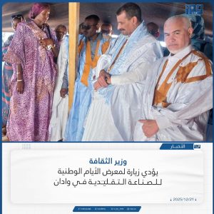 أدى معالي وزير الثقافة والفنون والاتصال والعلاقات مع البرلمان، الناطق باسم الحكومة، السيد الحسين ولد مدو، اليوم الأحد، صحبة والي آدرار، السيد عبد الله ولد محمد محمود، زيارة تفقد واطلاع لمعرض الأيام الوطنية للصناعة التقليدية في وادان، في نسخته الثالثة، المقام ضمن المعرض العام لمهرجان مدائن التراث.
