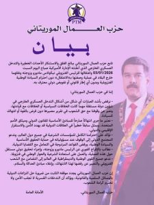 حزب العمال الموريتاني يدين اعتقال الرئيس الفنزويلي نيكولاس مادورو ويصفه بانتهاك صارخ للقانون الدولي