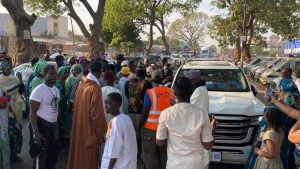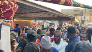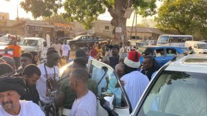 وقد استقبل سماحة الخليفة على مشارف المدينة من طرف عشرات السيارات والباصات الممتلئة بالمريدين والانصار، تحت قيادة كل من الشيخ مبارك فال والشيخة رقية ندونغ، بالإضافة إلى المريدين الذين عبروا عن فرحتهم بهذه الزيارة المباركة والميمونة.