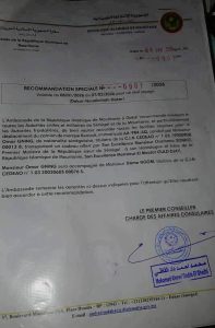 ووقّع التوصية القائم بالأعمال القنصلية، المستشار الأول بسفارة موريتانيا في داكار، مع ختم وتوقيع رسميين، مؤكداً شكر السفارة للسلطات المعنية على ما ستقدمه من تعاون واهتمام لتنفيذ هذه التوصية