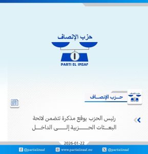 وقع رئيس حزب الإنصاف السيد محمد ولد بلال مسعود زوال اليوم بمقر حزب الإنصاف مذكرة تتضمن لائحة البعثات الحزبية إلى الداخل وذلك من أجل شرح مخرجات المؤتمر الوطني الأخير للحزب