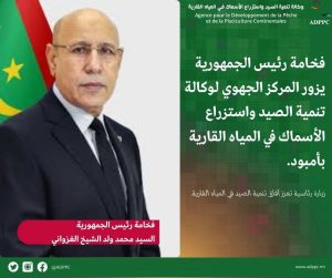 أدى فخامة رئيس الجمهورية، السيد محمد ولد الشيخ الغزواني، اليوم الأربعاء 11 فبراير 2026 زيارة تفقد واطلاع للمركز الجهوي لوكالة تنمية الصيد واستزراع الأسماك في المياه القارية بمدينة أمبود بولاية كوركل ، في خطوة تجسد العناية الخاصة التي يوليها فخامته لقطاع الصيد القاري وتعزيز مساهمته في تحقيق الأمن الغذائي ودعم التنمية المحلية.
