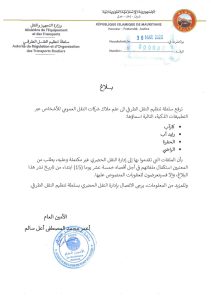 أعلنت سلطة تنظيم النقل الطرقي في موريتانيا، اليوم الاثنين، عن توجيه إشعار إلى ملاك شركات النقل العمومي للأشخاص عبر التطبيقات الذكية، يدعوهم إلى استكمال ملفاتهم الإدارية في أجل أقصاه 15 يوماً.