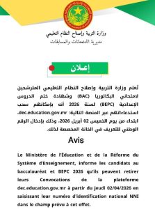 أعلنت وزارة التربية وإصلاح النظام التعليمي في موريتانيا أن بإمكان المترشحين لامتحاني البكالوريا وشهادة ختم الدروس الإعدادية (BEPC) لسنة 2026 سحب استدعاءاتهم ابتداءً من يوم الخميس 2 أبريل 2026.
