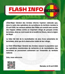 أعلنت هيئة الأركان العامة للقوات المسلحة المالية، اليوم الخميس، أن سلاح الجو نفذ ضربات دقيقة استهدفت مخبأ رئيسيًا لجماعات مسلحة شمال غربي مدينة ديورا، في منطقة موبتي وسط البلاد، وذلك في إطار عمليات المراقبة الإقليمية الجارية.